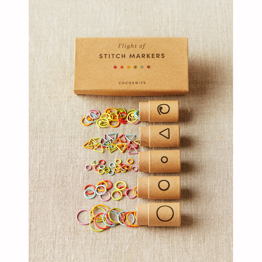 For anyone who’s not sure which style of Cocoknits stitch marker to try first, here’s a handy sampling. Just like a wine or craft beer tasting 'flight', our Flight of Stitch Markers offers a wide variety of styles and sizes to experiment with. This set, with 120 markers total, might be all you ever need!