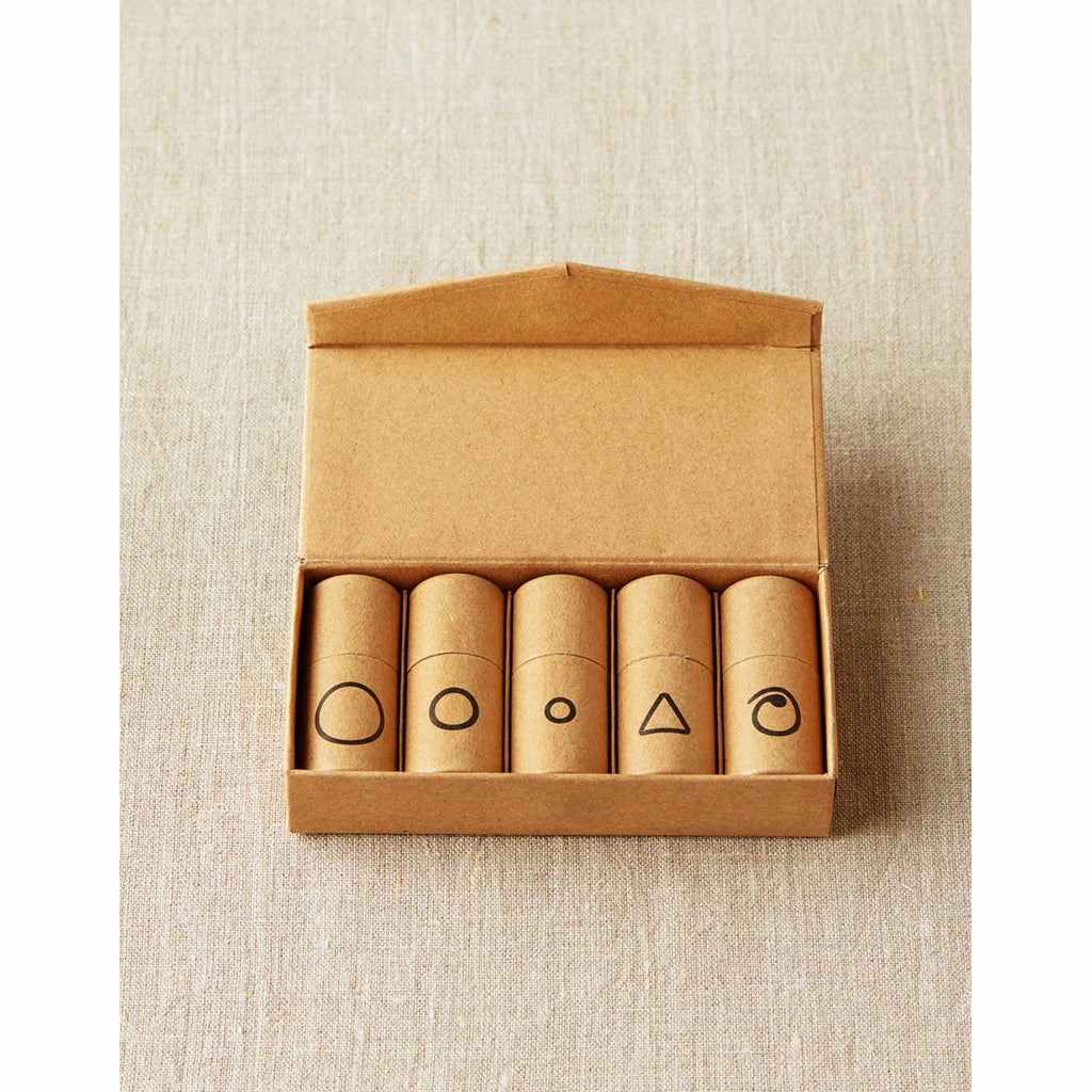 Each of the five types come in their own little Kraft paper tubes of 24 markers each, for easy storage and transport. The rainbow colors are ideal for the Cocoknits Method and perfect for gifting, beginner knitters, or anyone curious about trying some new marker shapes.