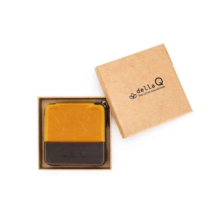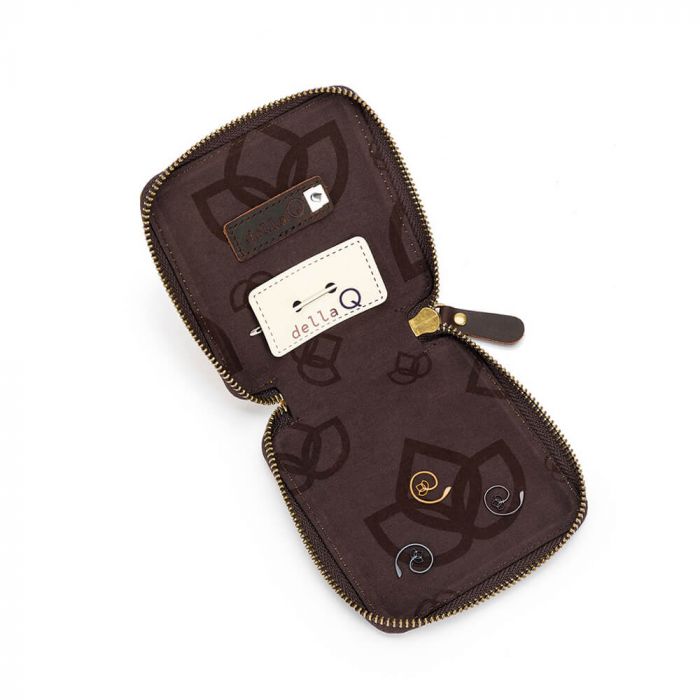 Safely store all the small important knitting accessories in the Della Q mini zip case. Mini Zip is a small and handy zippered storage case made of thick waxed fabric and leather. The case has a magnetic backing that holds needles, scissors and metal stitch markers in place.