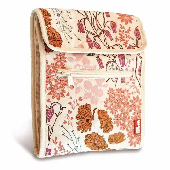 The case closes with two press studs and measures 23 x 18.5cm. It has a beautiful print with orange and pink flowers on a light-tinted background.