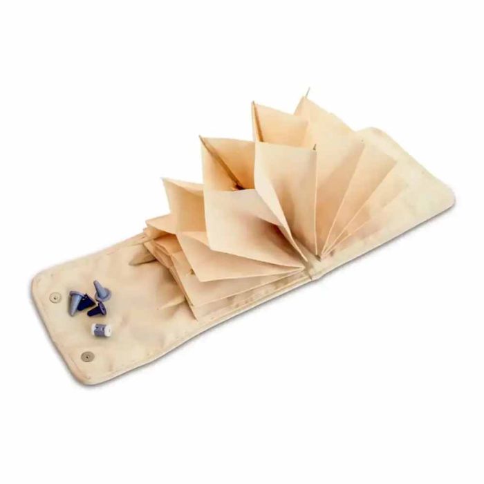 The handy fan model offers 8 open compartments in which circular knitting needles and loose cables can be stored. There is a zipper pocket on the front for small accessories, such as stitch markers and point stoppers.