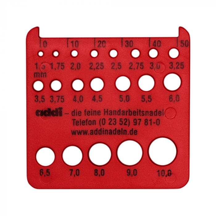 A knitting needle gauge is an indispensable tool for anyone who loves knitting. Use this red knitting needle gauge by Addi to measure and check the size of your needles. Suitable for sizes ranging from 1.50 to 10.00mm.