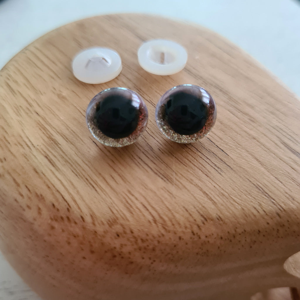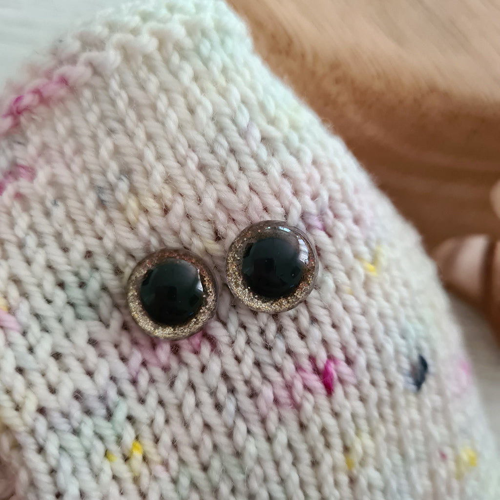 The safety eyes lock into place when the parts are pressed tightly together. After locking, the parts can no longer be removed. If the knitting surface is loose, just add a small piece of support fabric or felt to the wrong side.