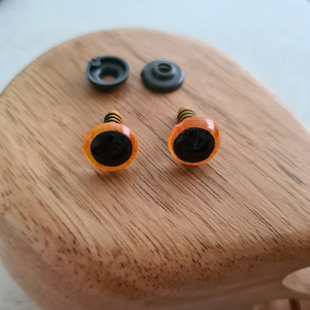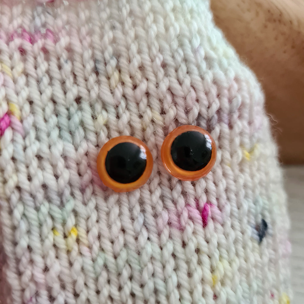 The safety eyes lock into place when the parts are pressed tightly together. After locking, the parts can no longer be removed. If the knitting surface is loose, just add a small piece of support fabric or felt to the wrong side.