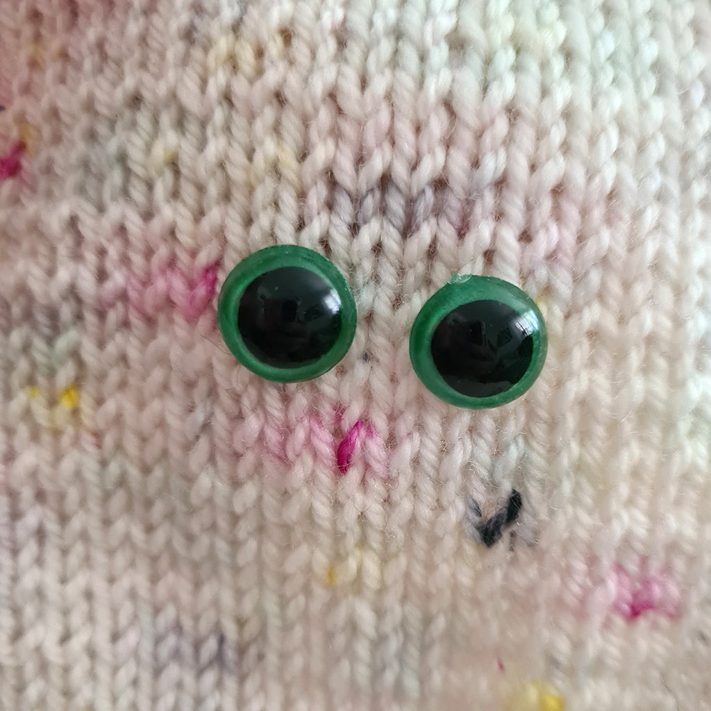 The safety eyes lock into place when the parts are pressed tightly together. After locking, the parts can no longer be removed. If the knitting surface is loose, just add a small piece of support fabric or felt to the wrong side.